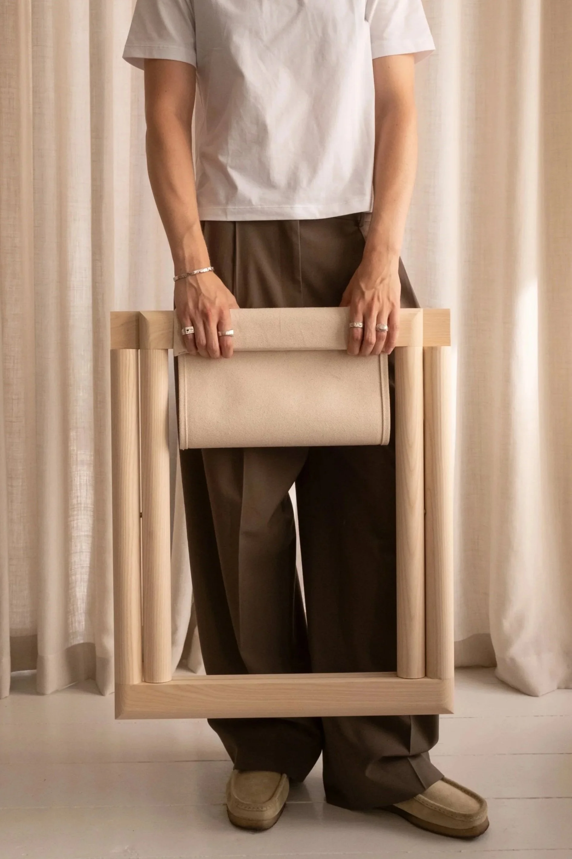 A compact, lightweight seat designed for easy storage and portability. Inspired by Scandinavian design principles, its simple frame and fabric seat fold flat, making it practical for both everyday use and small-space living.